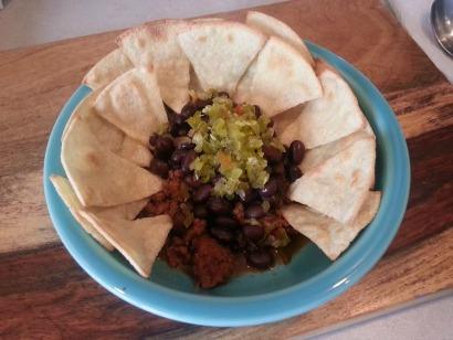 My meal calls for 85g chicken breast and 150g quinoa. I subbed the chicken breast out for lean beef, cooked in taco seasoning. For the quinoa, I subbed in corn tortillas (cut into chips then toasted under the brioler), and black beans. Topped with diced jalapenos.