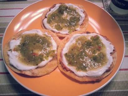 Toasted the corn tortillas under the broiler until crispy, then topped each with fat-free refried beans, Greek yogurt, diced jalapenos, and green salsa.